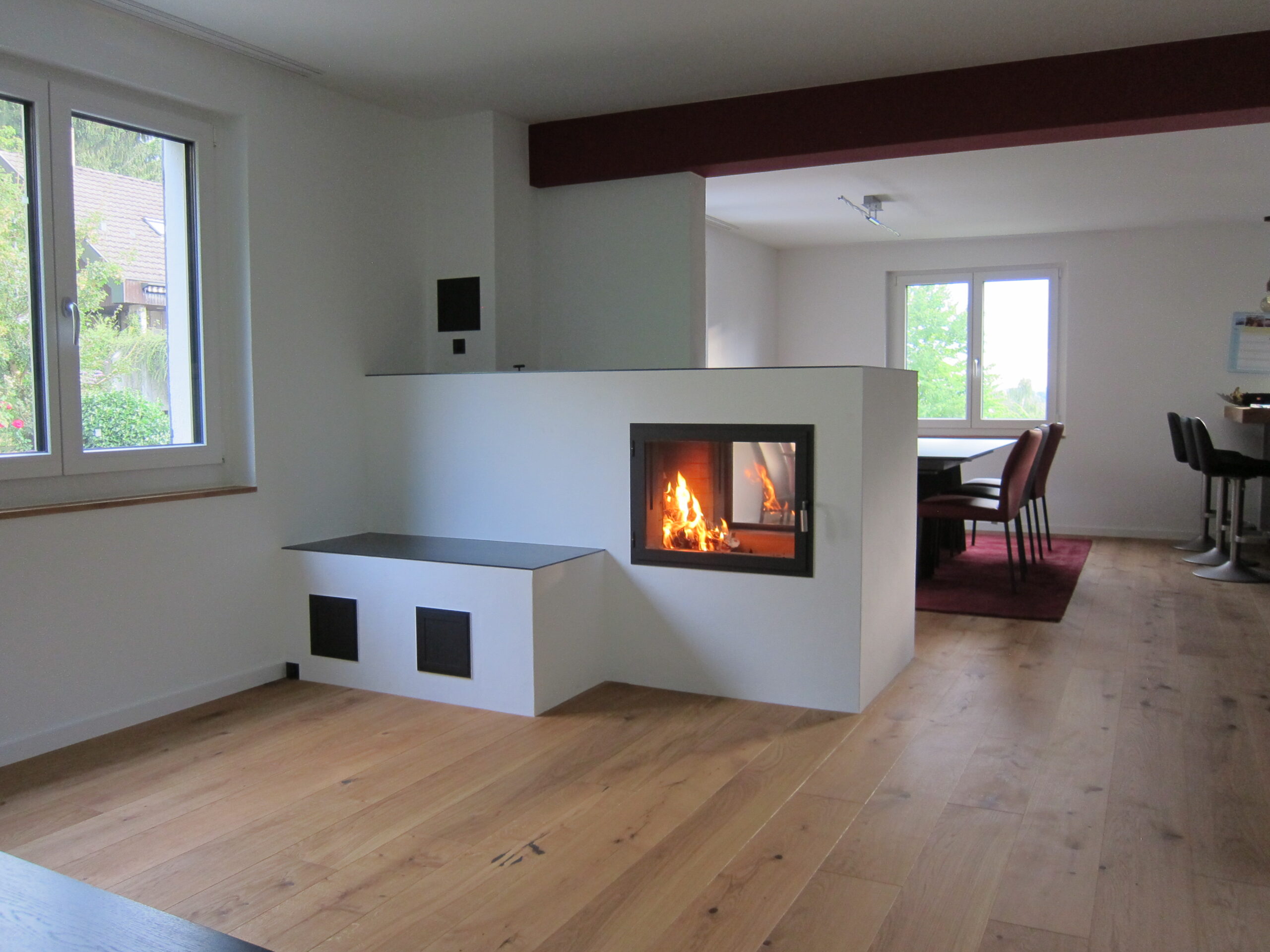 Wärmespeicherofen mit beheizter Sitzbank, zwei Feuertüren, und Abdeckung aus schwarzem Rohstahl.