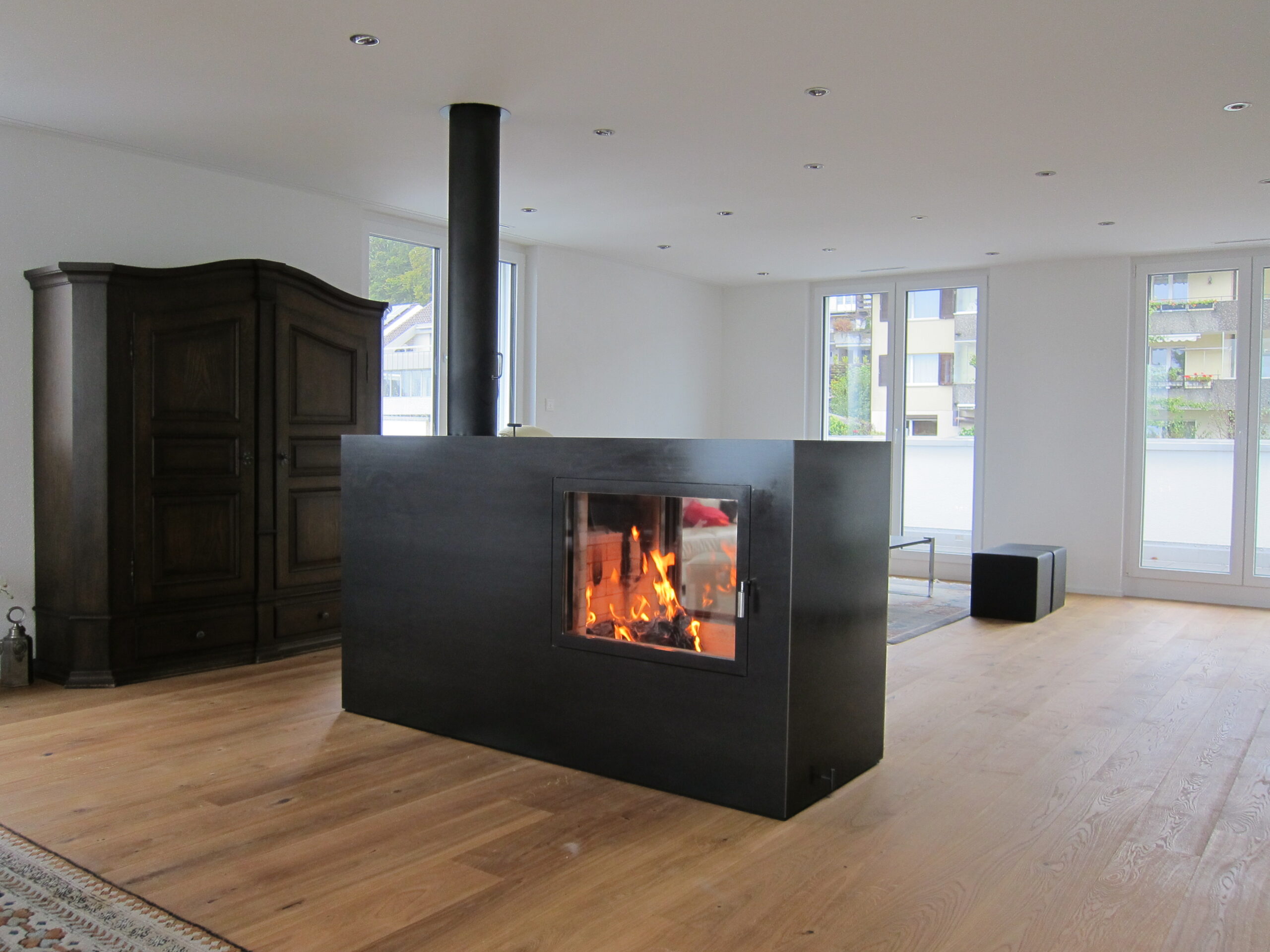 Ofen als Raumtrenner und mit zwei Feuertüren.
