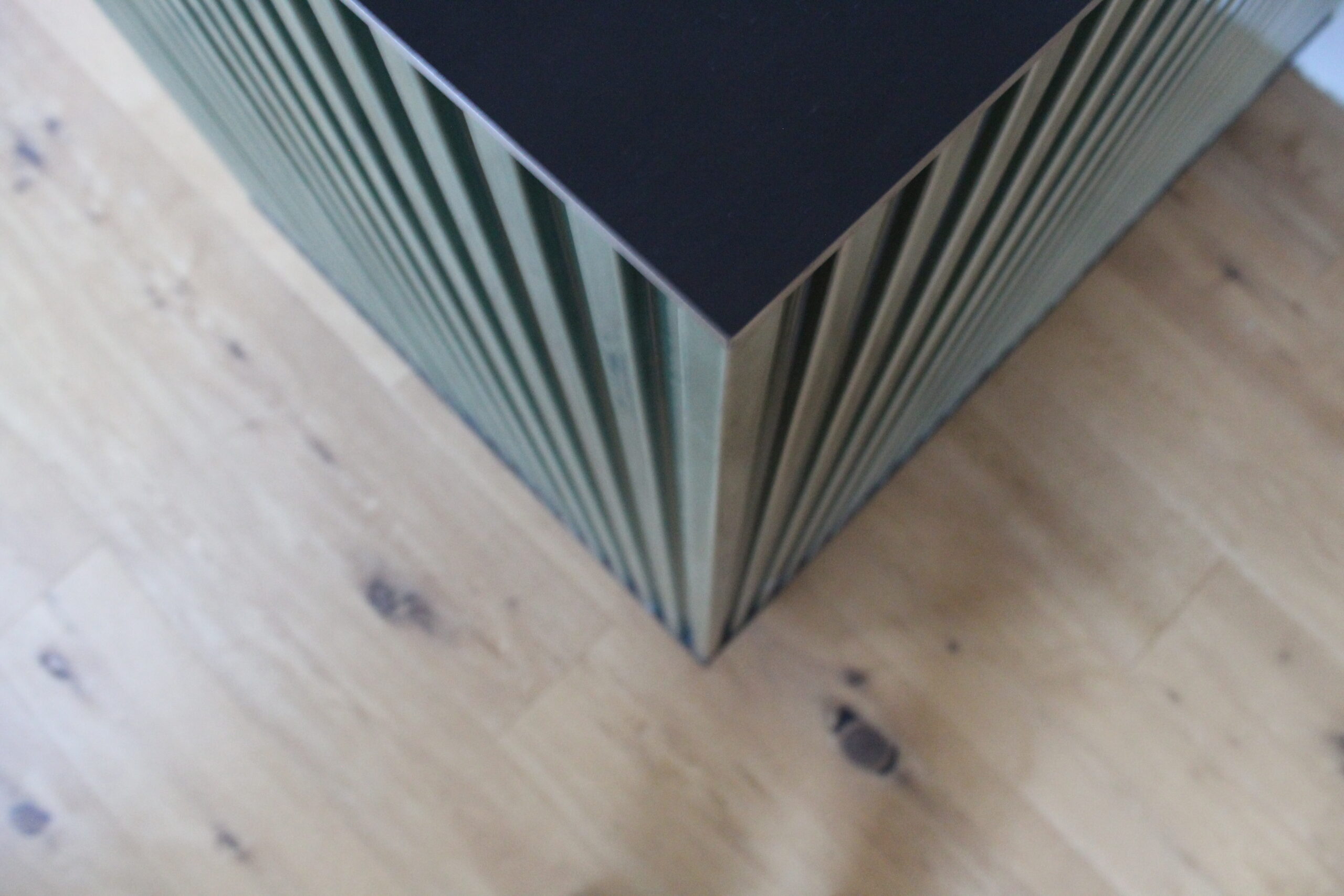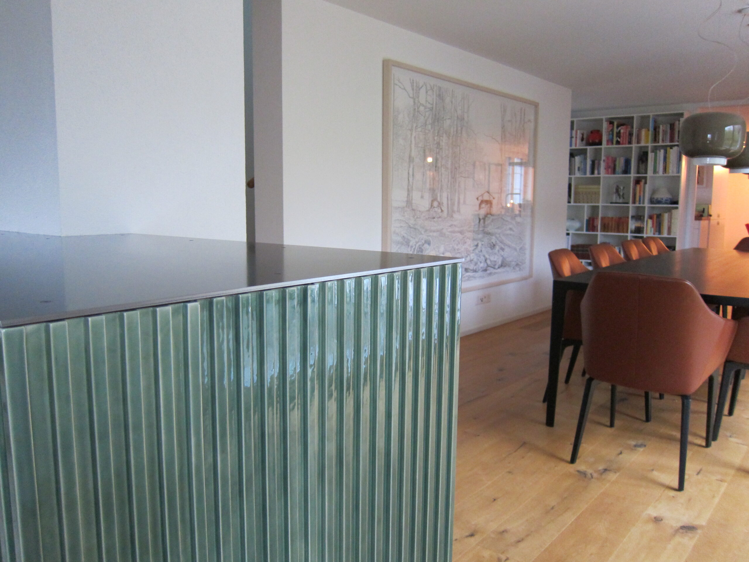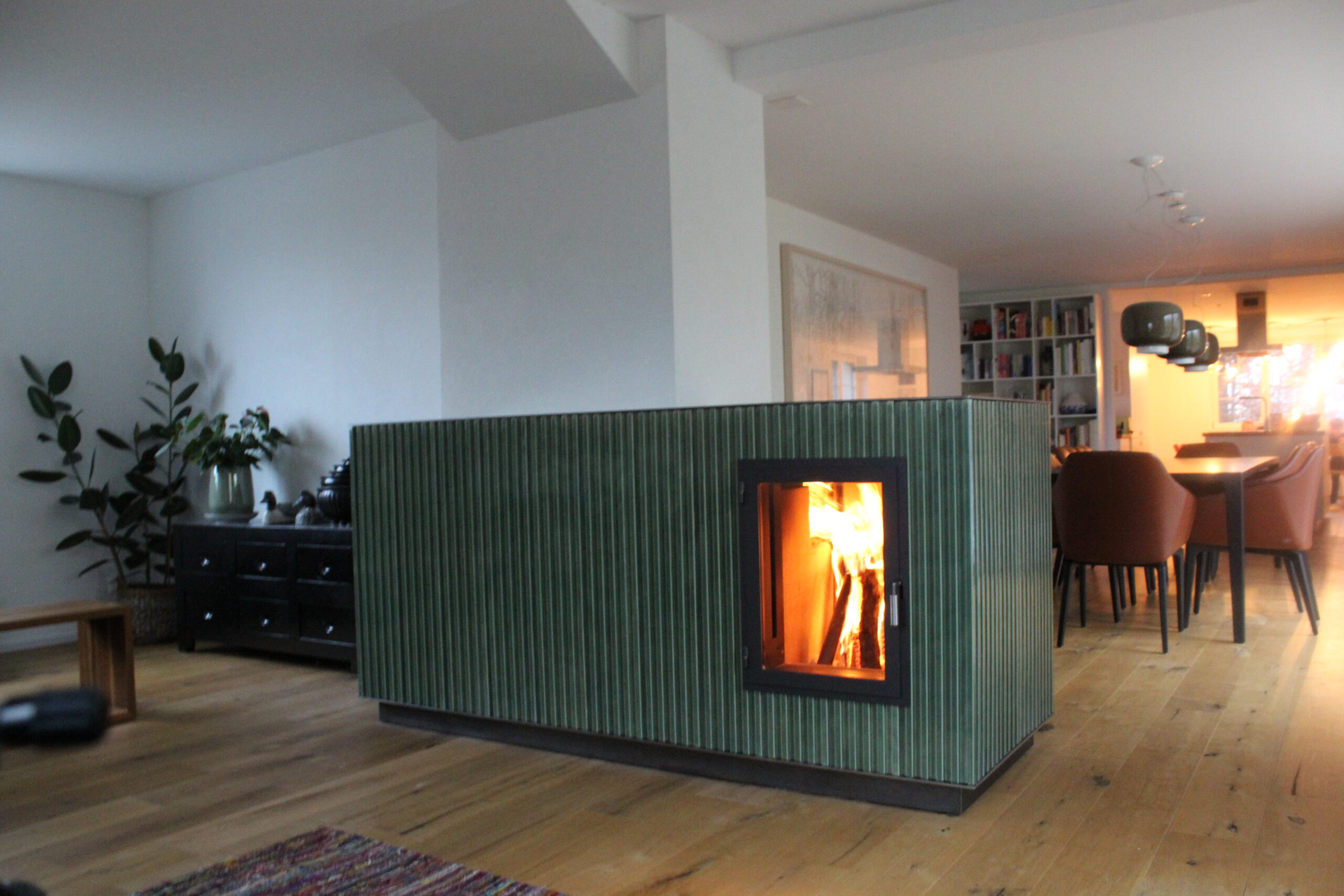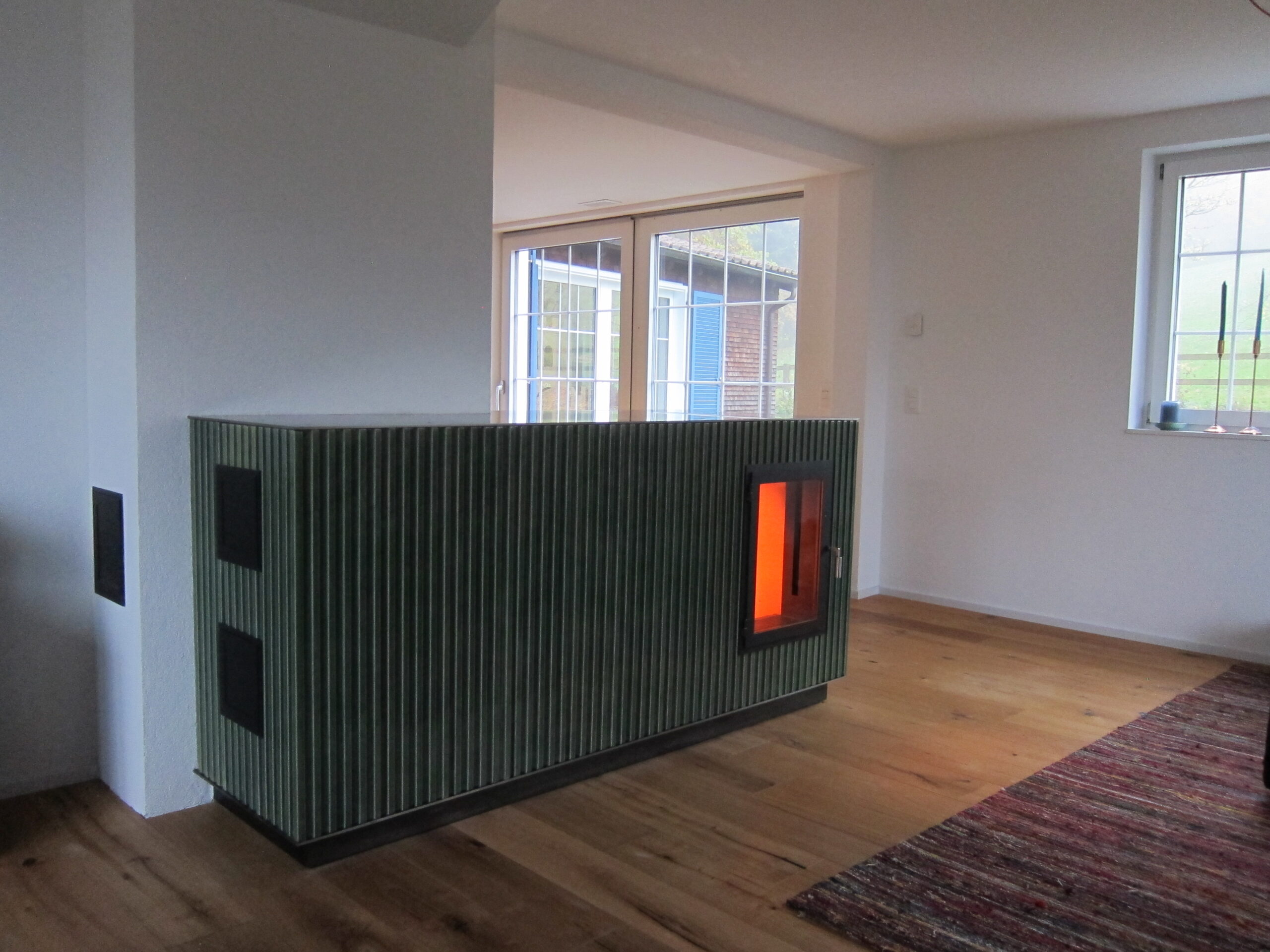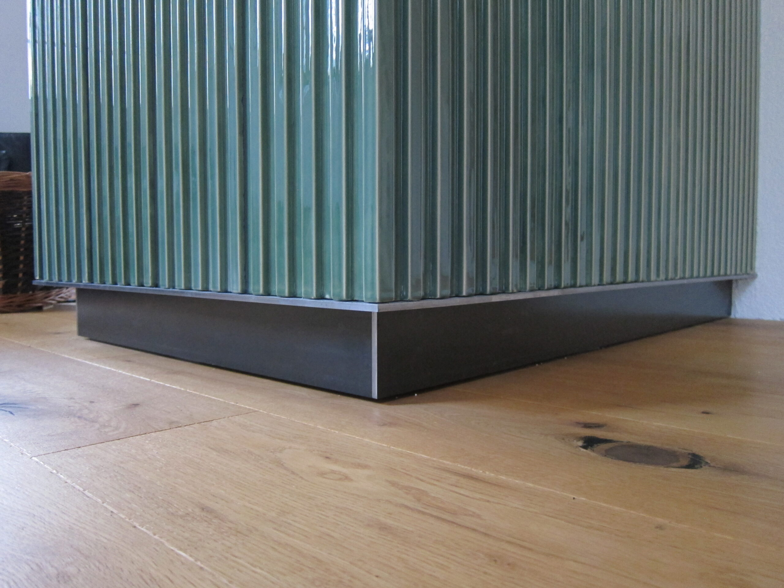 Kachelofen mit neuer Generation von Rillen-Kacheln. Spezielle Eckausführung. Man sieht kaum wo die Stösse sind. Deckel und Sockel aus Schwarzblech.
